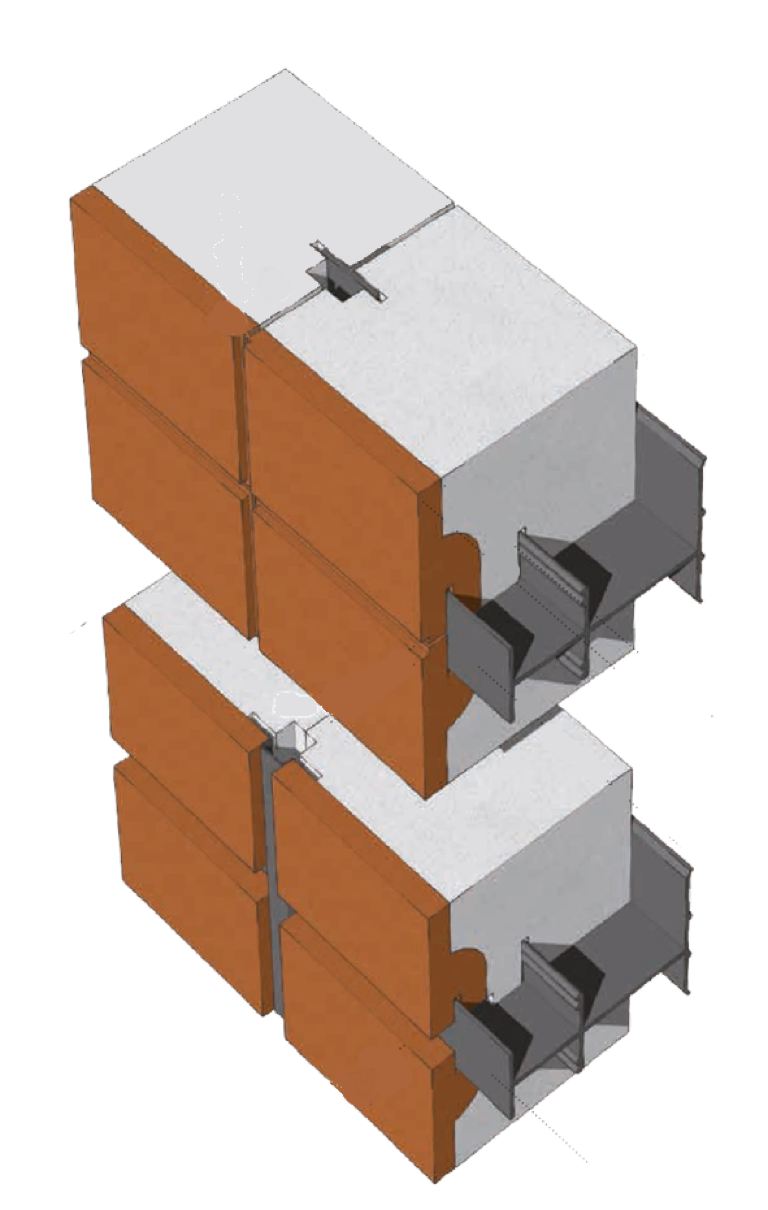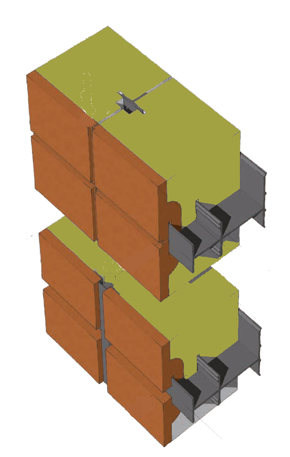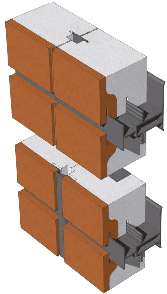 El panel está compuesto por una placa de cemento reforzada con fibra de vidrio unida al material de aislamiento. La placa incorpora una acanaladura superior e inferiormente para alojar los perfiles de fijación.