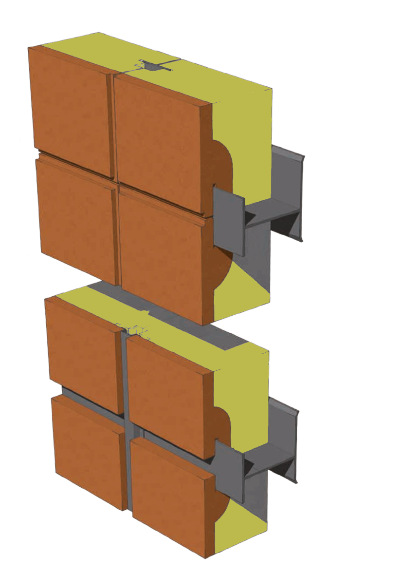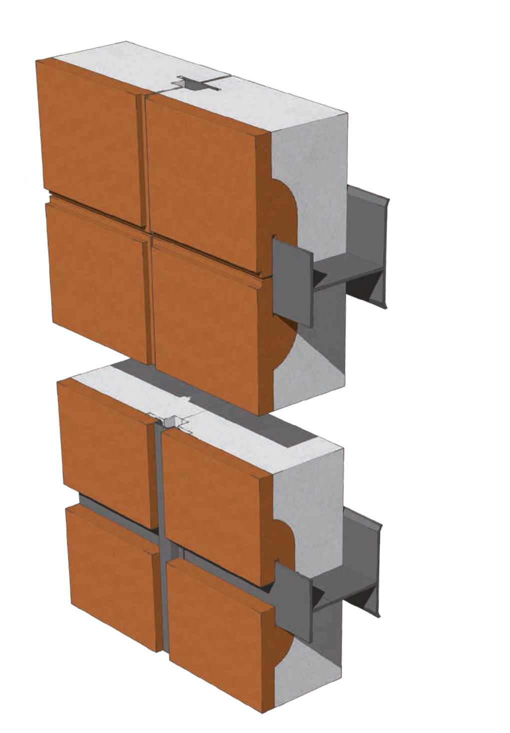 El panel está compuesto por una placa de cemento reforzada con fibra de vidrio unida al material de aislamiento. La placa incorpora una acanaladura superior e inferiormente para alojar los perfiles de fijación.